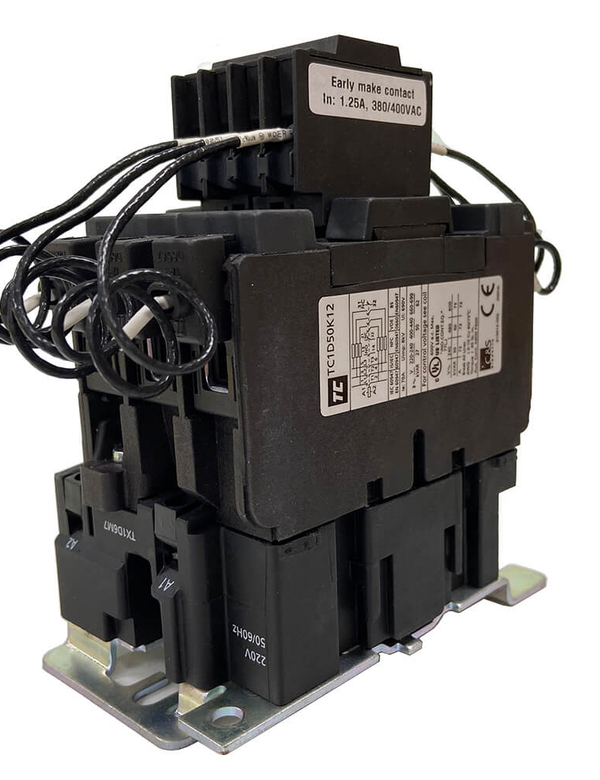 Capacitor contactor are specially designed to meet stringent requirements of capacitor switching as deliberated above. These contactors are fitted with front- mounted block of 3 early make auxiliary contact in series with quick discharge damping six-resistors-2 per phase to limit peak current to value within contactor making capacity such that normal rated capacitor current is carried by main contacts which, after closing, effectively short out the resistors.