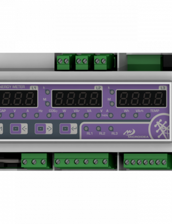 ENERGY METER (DIN) Last-generation DIN rail multimeter in true RMS suitable for the 4.0 industry and for energy monitoring which can be installed in mono or three-phase mode. Equipped with 3 LED displays for measures indication, can display 14 parameters for each phase. The optoisolated TTL output is able to convey countless different measures and so it represents an essential instrument for situations where a comprehensiveness of data is needed, which a regular multimeter cannot provide. It is also equipped with 3 programmable relays which activate depending on alarms conditions that can be set from the user. The signal can be collected by a PLC or a SCADA system. cosΦ in four quadrants harmonic distortion single phase and total Recording of max values of tension, current, harmonic distortion and temperature W-Wh-VA-Vah-Var-Varh Energy measure imported and exported For a complete list of the detectable measures, relate to the datasheet.